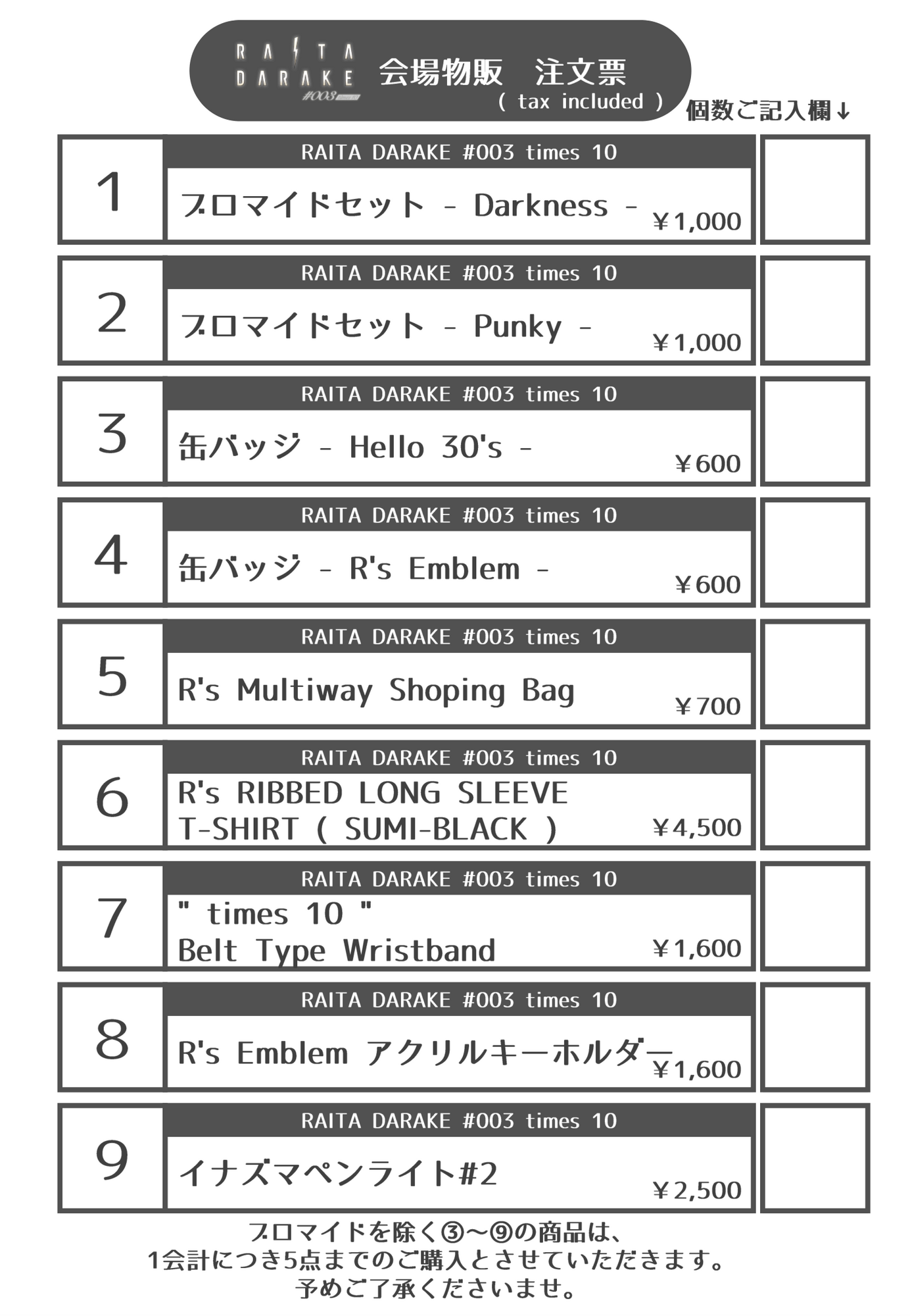 RAITA DARAKE #003 times 10 | オリジナルグッズ 会場物販のお知らせ